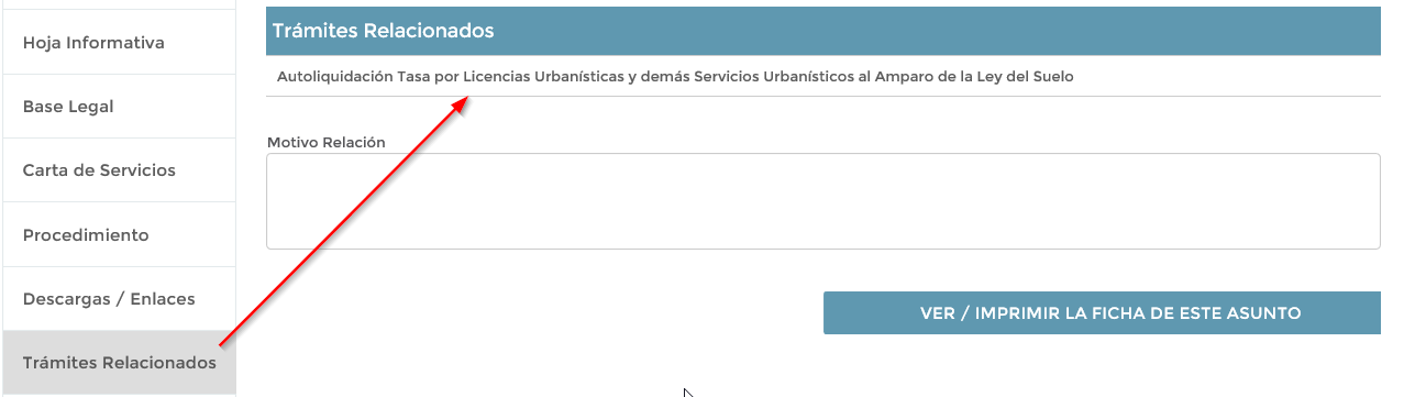 Por ejemplo, en un asunto de licencia de obra, es posible que nos aparezcan, como trámites relacionados, las autoliquidaciones de pago de las diferentes tasas asociadas a la solicitud de la licencia.